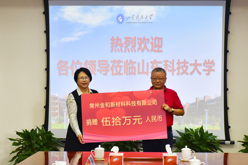 捐赠仪式上,科技处处长陈连军与常州金和新材料科技有限公司党支部书记钱雪忠代表双方签订捐赠协议。常州金和新材料科技有限公司出资50万元支持学校教育事业发展。李玉霞代表学校接受捐赠并回赠捐赠证书,向栾润东颁发开云·体育兼职教授聘书。