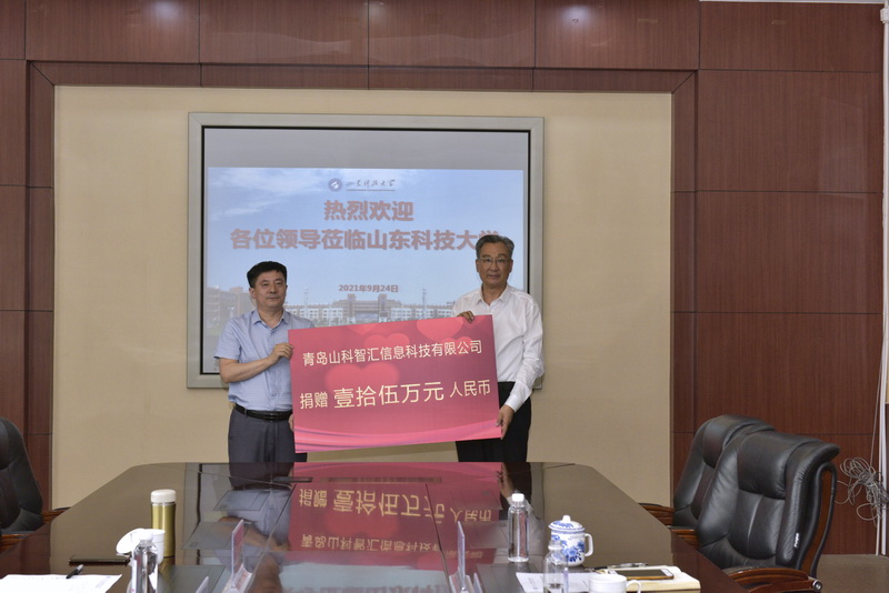捐赠仪式上,山东蓝光软件有限公司向学校捐赠价值200万的软件和10万元,青岛山科智汇信息科技有限公司向学校捐赠15万元支持学校教育事业发展。王少鹏代表学校接受了捐赠,并回赠致谢牌。