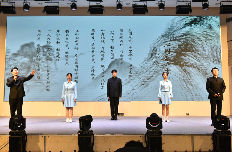 在比赛环节间隙,诗朗诵、歌曲等节目穿插上演。学校留学生的诗词朗诵《行路难》《再别康桥》字正腔圆,文法大艺团声乐队的歌曲《岳阳楼记》悠扬绵长,文法学子将《沁园春·雪》《小平,您好》《满江红·江上青百年诞辰祭》《科学发展观之歌》《念奴娇·追思焦裕禄》等诗作朗诵出爱国真情,让诗词大会成为学生品味党史、感悟传承、夯实文化底蕴的思想政治教育实践课新载体,以此献礼党的二十大。
