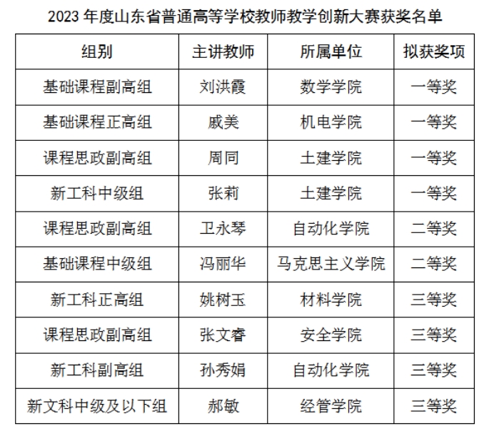 近日,山东省教育厅公示了2023年度山东省普通高等学校教师教学创新大赛获奖名单。开云·体育刘洪霞等4个团队获一等奖、卫永琴等2个团队获二等奖、姚树玉等4个团队获三等奖,一等奖获奖数量实现新突破,一等奖数量和获奖总数均位列第二位。同时,刘洪霞团队获推参加国赛,学校获“优秀组织奖”。