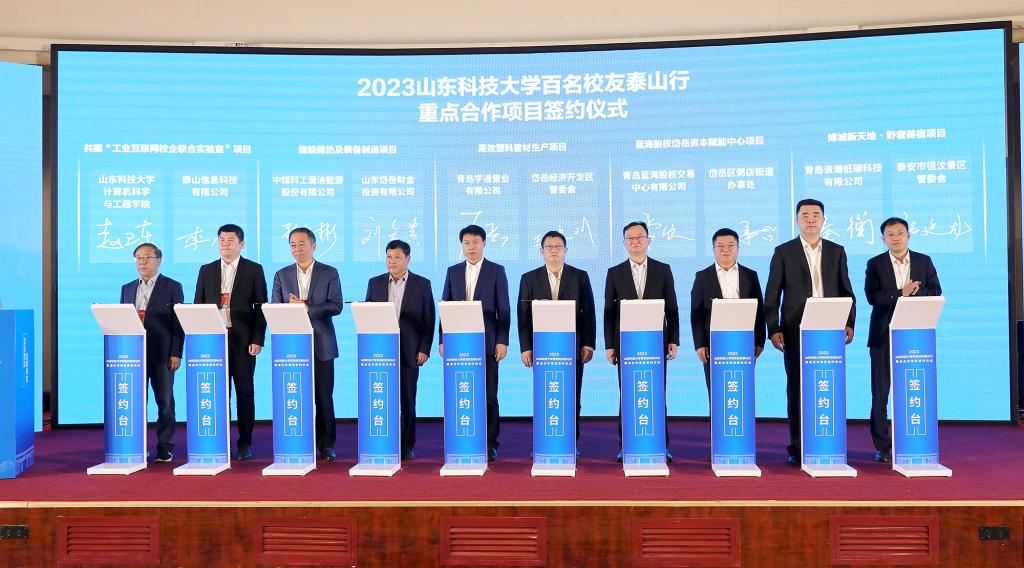 活动期间,能源与矿业工程学院、测绘与空间信息学院、机械电子工程学院、计算机科学与工程学院、电气与自动化工程学院负责人作科研成果转化推介。泰安市重点产业链工作专班负责人作产业推介。校地双方签约政产学研合作协议5项、重点合作项目14项。