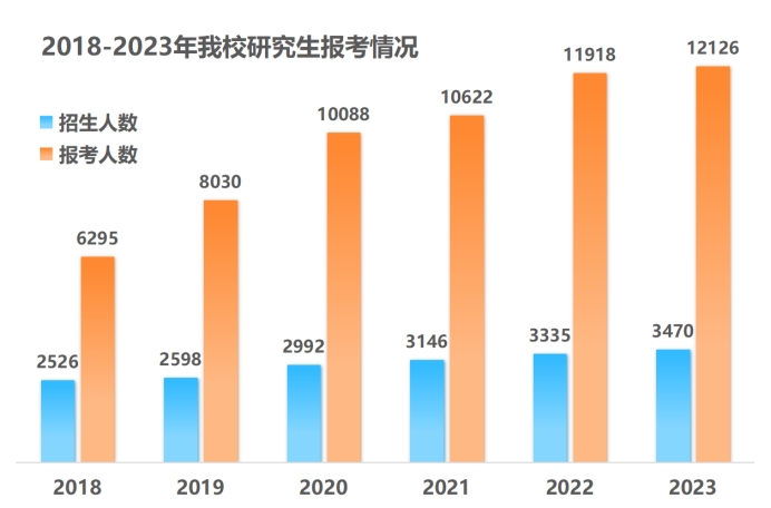 自2018年学校第三次党代会召开以来,学校实现研究生招生数量和质量的“双提升”。在研究生报考及招生人数方面,2020年学校研究生报考人数首次突破万人,2023年报考人数再创新高,达到12126人,报考人数较2018年增长92.6%;今年,学校研究生招生人数3470人,较2018年增长37.4%。在生源质量方面,2023年推免生接收人数157人,较2018年增长282.93%;考录比由2018年的2.55:1提升到2023年的3.75:1;硕士一志愿上线人数3453人,较2018年增长84.1%。