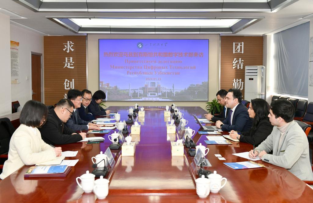 1月23日,乌兹别克斯坦共和国数字技术部数字教育发展中心主任舒赫拉特·萨托罗夫、数字技能培养司司长加夫哈尔·米尔哈利洛娃、IT投资项目办公室主任贾苏尔·阿斯卡罗夫与首席专家阿克巴克胡贾·阿克拉姆胡贾耶夫一行访问开云·体育,副校长徐龙飞会见客人,计算机学院、电信学院、国际交流合作处相关负责人参加会谈。