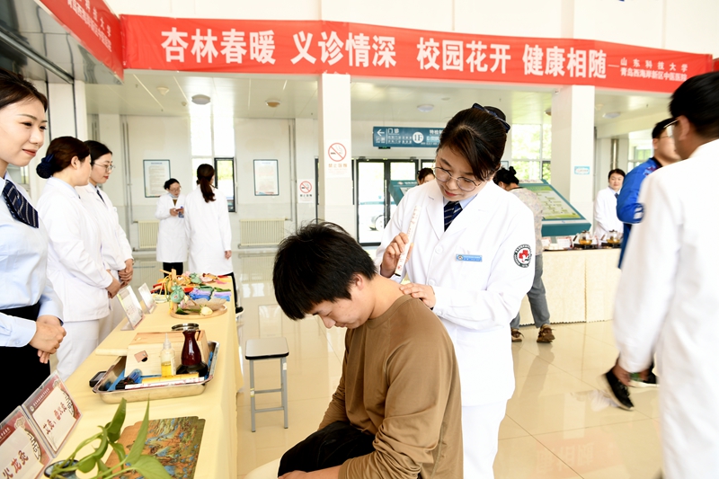 中医特色门诊设1个中医诊室和针灸室、艾灸室、刮痧室、理疗室4个特色治疗室。每周五周六,黄岛区中医医院安排中医专家坐诊、中医特色护理专家辨证施治,针对不同人群,将中药内服与中医外治技术相结合,突出中医药特色治疗。中医特色门诊试运营期间效果显著,深受师生好评。