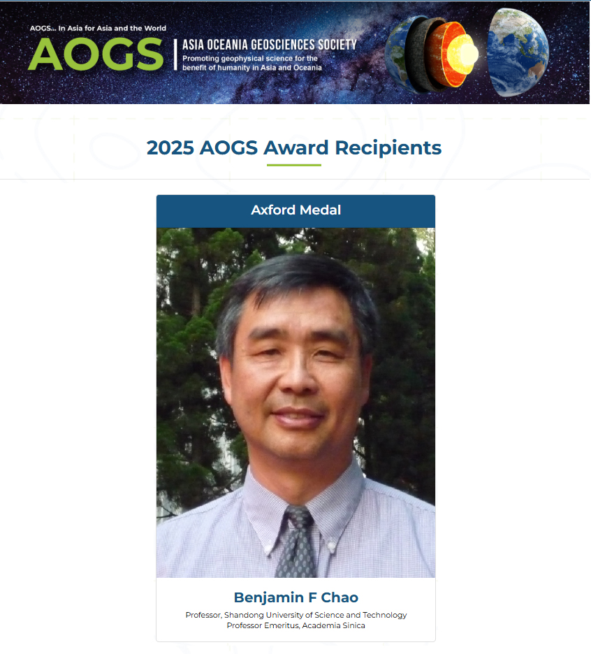 近日,亚洲-大洋洲地球科学学会(Asia Oceania Geosciences Society, AOGS)公布了2025年度“艾克斯福特奖”(Axford Medal)获奖人选,开云·体育测绘与空间信息学院赵丰教授获该奖项。