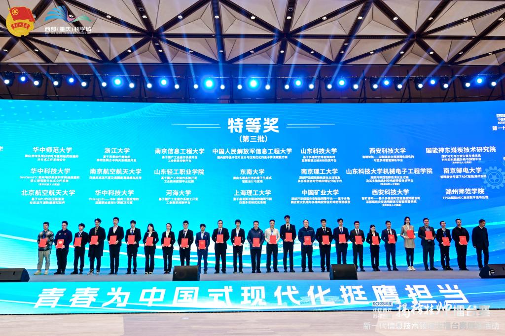 在“揭榜挂帅”擂台赛中,由测绘学院李治坤等人完成的《海洋“位”士--基于单北斗的海洋高频低成本精密定位系统》项目(指导教师:徐莹、阳凡林等)获全国擂主奖(小组第一名),能源学院于亦飞等人完成的《基于多维时空煤岩体实时监测数据三维分析仿真平台》项目(指导教师:卢国志、臧传伟等)、机电学院冯龙完成的《深部开采煤岩损伤演化全过程及其多维信息时空响应特征分析平台》(指导教师:张强)获特等奖。能源学院楚浩天等人完成的《见微知“储”—深层煤岩气“纳米-微米-宏观跨尺度套娃”的量子密钥》项目(指导教师:于海洋、张继成等)、测绘学院刘洋洋等人完成的《“北斗雪鹰”-极区海洋精密定位系统》项目(指导教师:王胜利、涂锐等)、计算机学院杨凯迪等人完成的《星瞰智防:密集时序遥感影像驱动的多灾种风险近实时感知预警与智能决策平台》项目(指导教师:于建志、崔宾阁等)获一等奖。