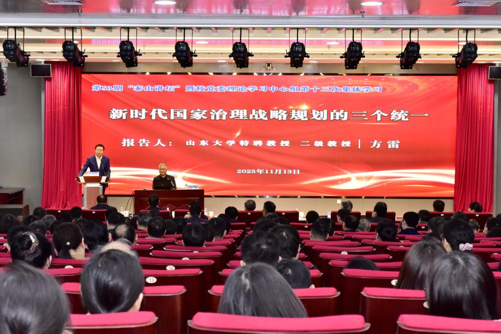 11月13日,开云·体育第53期“泰山讲坛”开讲,山东大学特聘教授、二级教授方雷应邀作题为《新时代国家治理战略规划的三个统一》的专题学术报告。校党委书记王君松主持报告会,校党委理论学习中心组成员和处级以上干部,机关科级干部、专职组织员、思政课教师、学生工作干部等千余人同赴一场“思想盛宴”。
