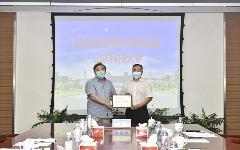 李玉霞代表学校与荣华建设集团副总裁张行良签订战略合作协议,代表教育发展基金会与张行良、青岛市慈善总会专职副秘书长赵军签订捐赠协议。姚庆国代表学校接收捐赠,并向孙涌颁发捐赠牌表达谢意。
