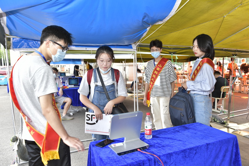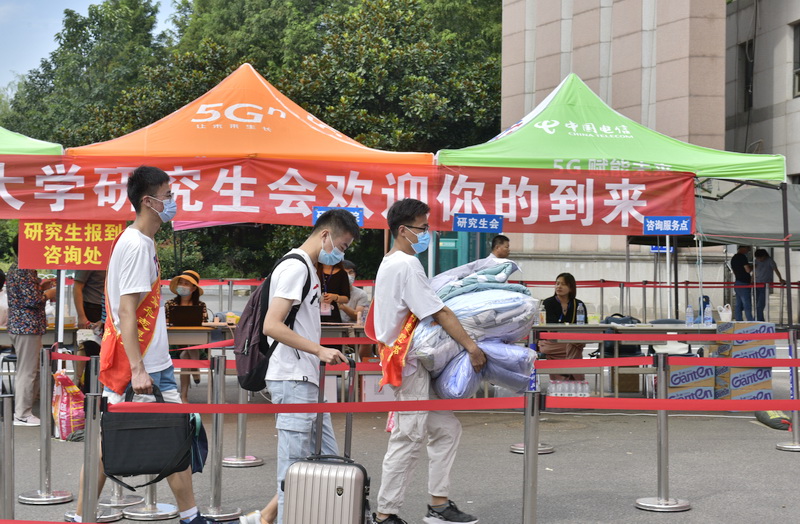 迎新现场,党委学校办公室、研究生院、学生工作处、团委、安全管理处、后勤管理处、网络安全与信息化办公室等部门的工作人员和来自各个学院的志愿者在各自的岗位上忙碌着,认真、耐心地引导帮助新生。体温检测、健康码查验、身份信息核对、物品消杀等环节井然有序,前来报到的研究生“刷脸”报到,所有手续“一站式”解决;工作人员和大学生志愿者认真热情地做好服务工作,为新生答疑解惑、搬运行李,解除新生入校困难……