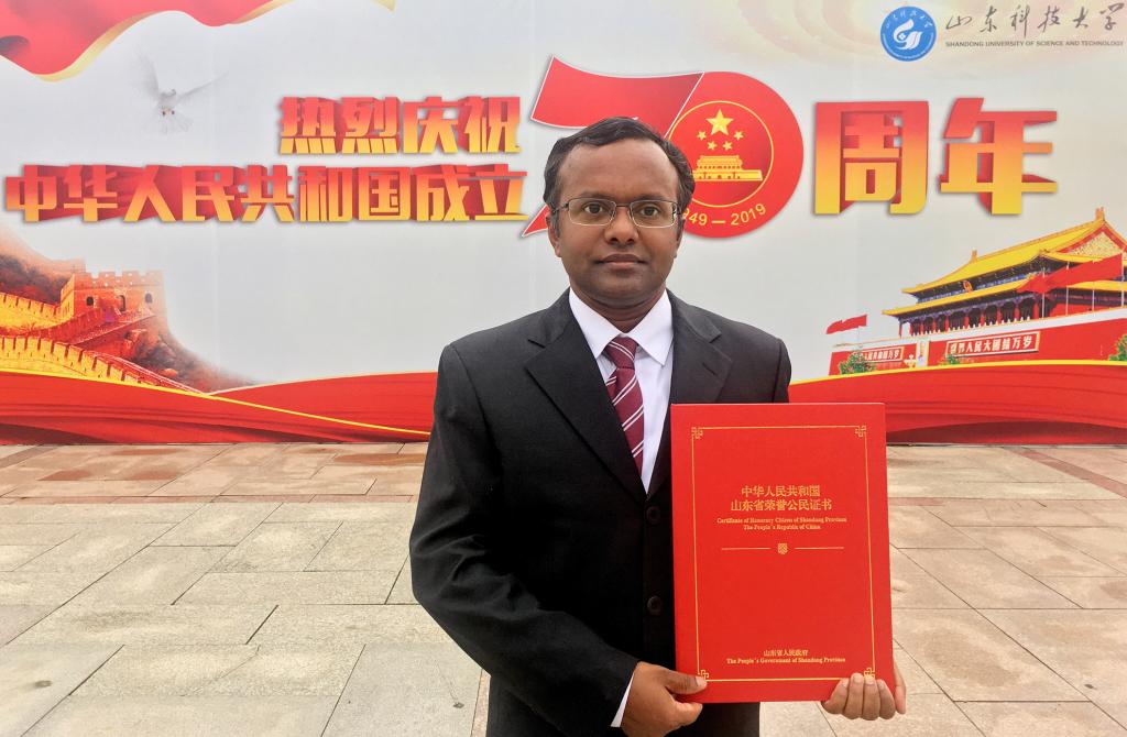 9月29日,在新中国成立70周年到来之际,我校电信学院外籍教授刘山作为“山东省荣誉公民”代表,受邀参加了在济南举行的2019年度“山东省荣誉公民”授荣仪式,省委书记刘家义为刘山颁发荣誉证书,鼓励肯定了其在我省对外交流合作等方面做出的贡献。2019年度在鲁高校工作获此殊荣的外籍专家仅有6位。