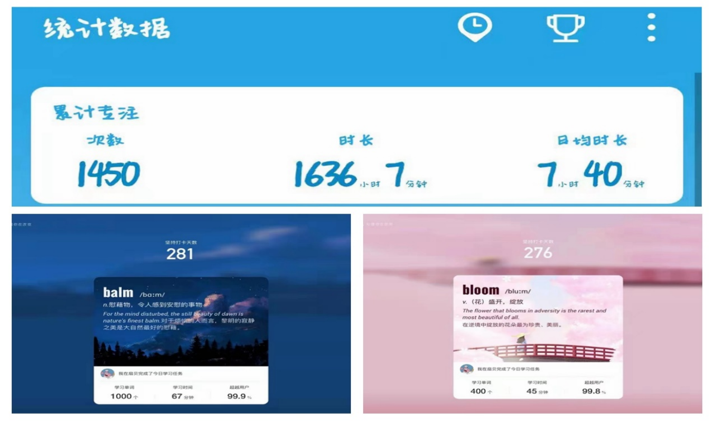 除了亮眼的政治成绩,陈楠79分的英语成绩也很让人羡慕。“我真的不是凡尔赛,英语真是实打实的分数顶上去的。”作为一个六级刷了好几遍才刚刚过线的人,陈楠为了提升英语短板,利用扇贝单词APP打卡280多天。“咸鱼一只,坚持下去就有翻身的可能。”经过自己的努力,陈楠最终将自己的劣势转变为优势。