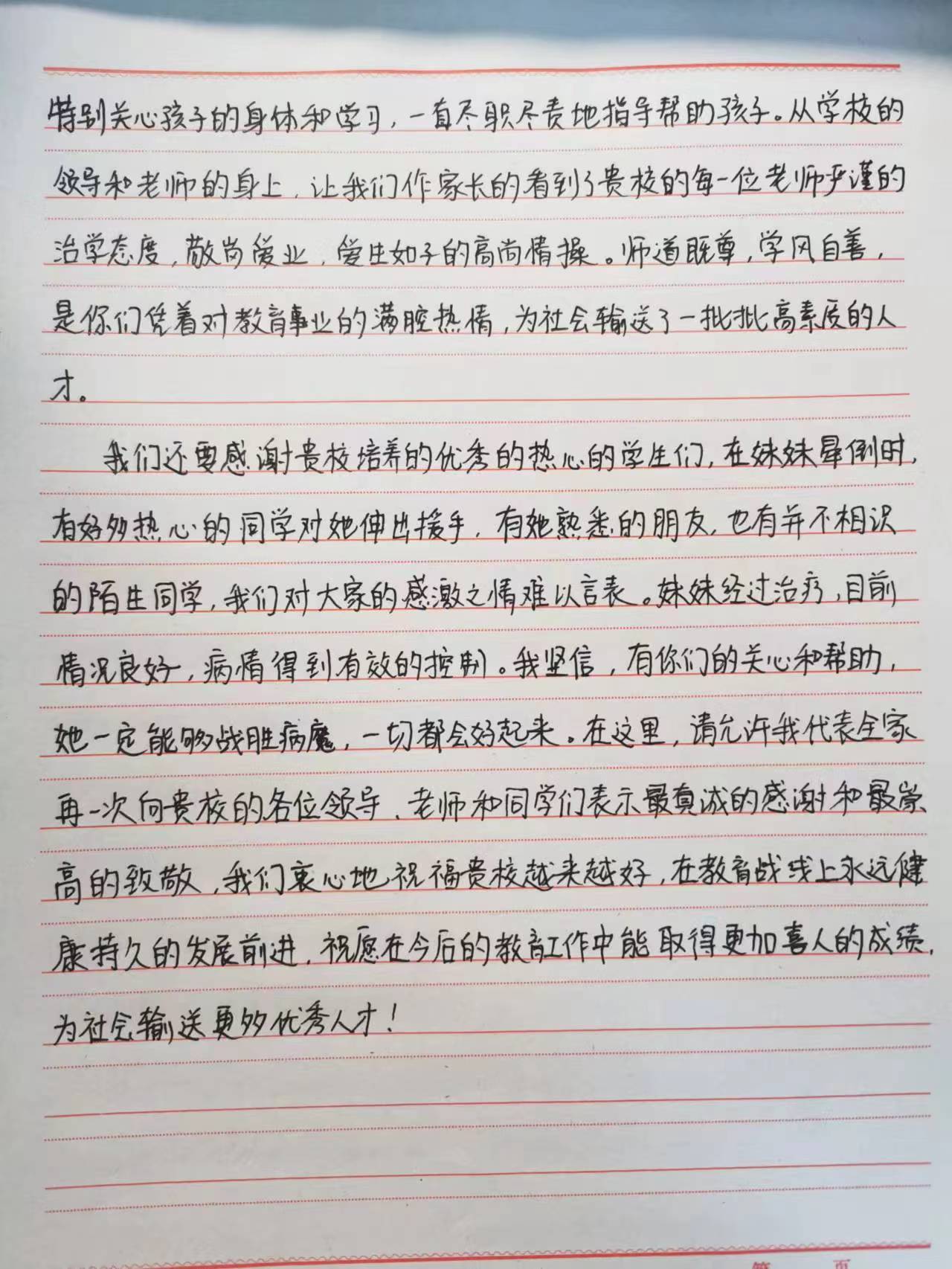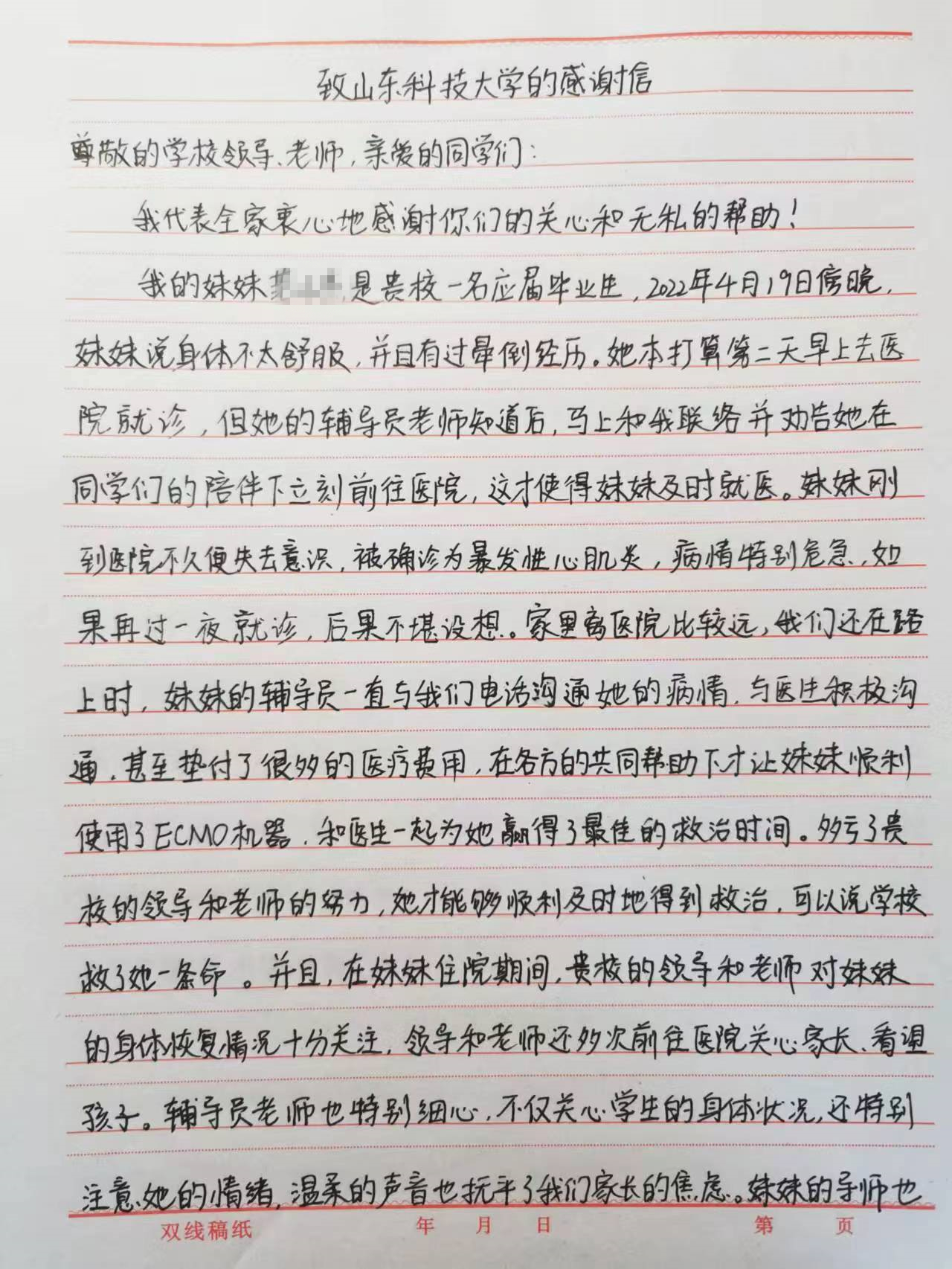 “我代表全家衷心感谢你们的关心和无私的帮助!”近日,我校经管学院收到了一封情感真挚的感谢信。这封信由学院研究生范慧(化名)的家长亲手写就,只为感谢学院辅导员江谭“生死时速”救助学生的事迹。