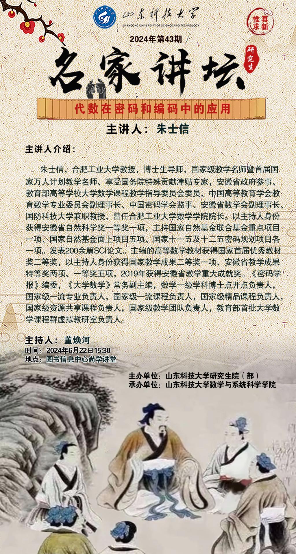 “名家讲坛”2024年第43期:代数在密码和编码中的应用(总937期)