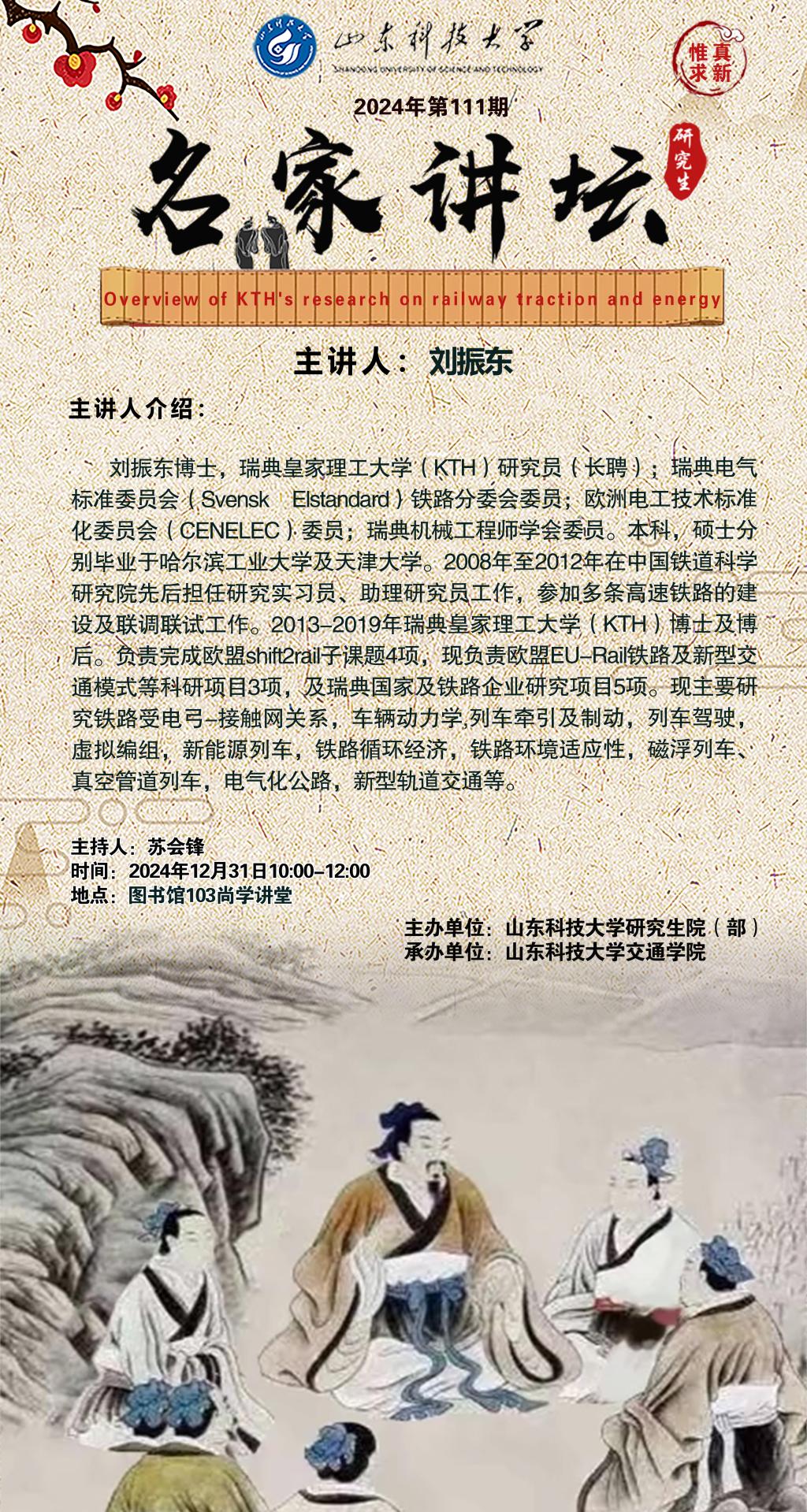 “名家讲坛”2024年第111期:Overview of KTH's research on railway traction and energy(总1005期)
