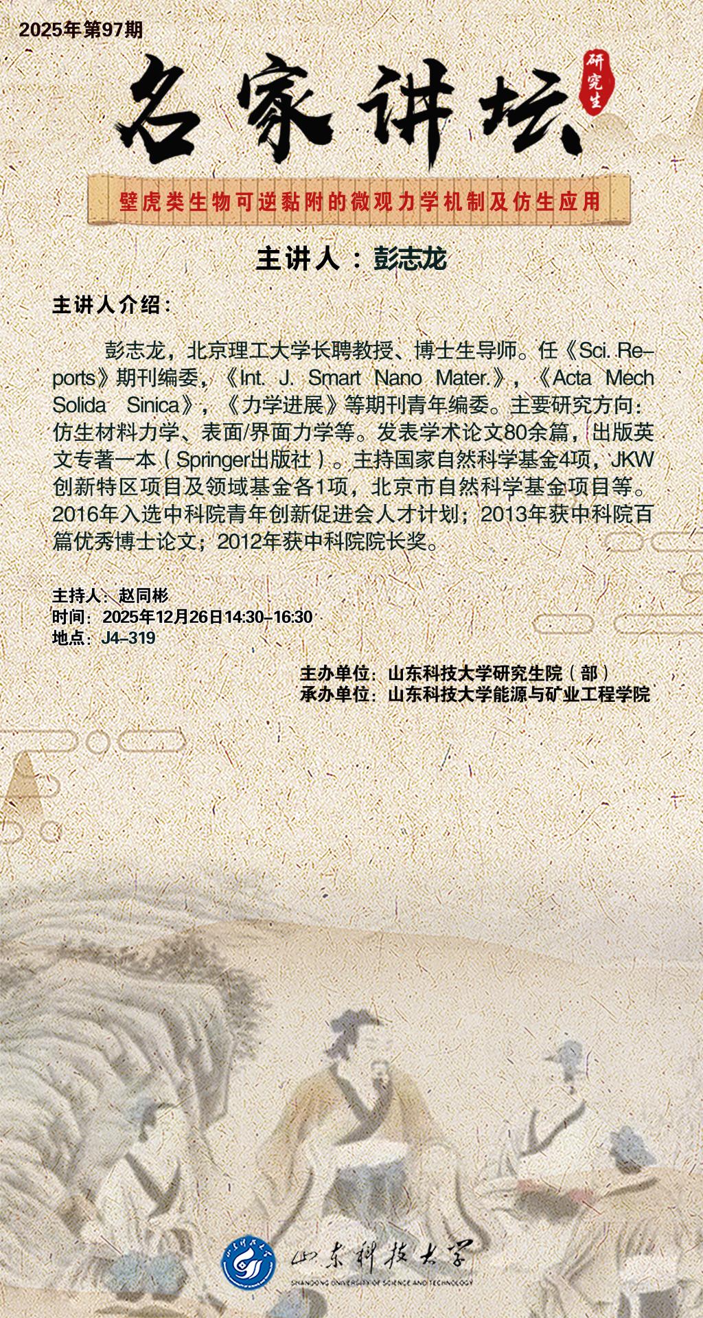 “名家讲坛”2025年第97期:壁虎类生物可逆黏附的微观力学机制及仿生应用(总1102期)