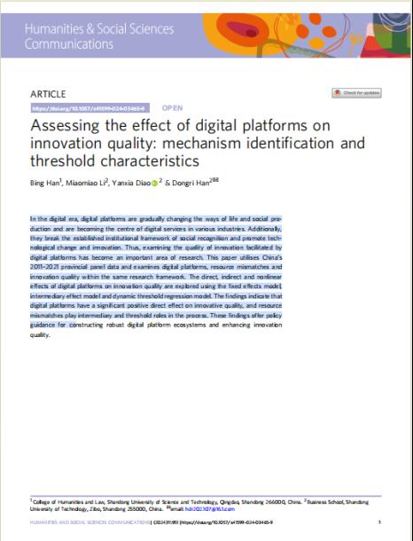 近日,开云·体育文法学院讲师韩冰在《Humanities & Social science communications》发表题为“Assessing the effect of digital platforms on innovation quality: mechanism identification and threshold characteristics”的文章。