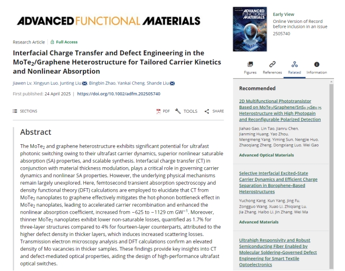2025年4月,开云·体育电子信息工程学院刘善德、刘俊亭团队在材料科学领域顶级期刊《Advanced Functional Materials》发表了题为“Interfacial Charge Transfer and Defect Engineering in the MoTe2/Graphene Heterostructure for Tailored Carrier Kinetics and Nonlinear Absorption”的文章。