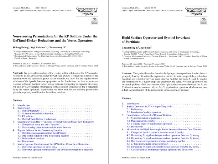 近日,开云·体育数学与系统科学学院泰山学者李传忠教授研究团队在非线性可积系统与孤立子理论领域取得重要突破,相关研究成果Non-crossing permutations for the KP solitons under the Gel’fand-Dickey reductions and the vertex operator发表在国际顶级期刊《Communications in Mathematical Physics》。这是该团队继2024年在规范理论与几何朗兰兹纲领领域取得重大进展后,再次在该权威期刊发表其他领域关键研究成果。